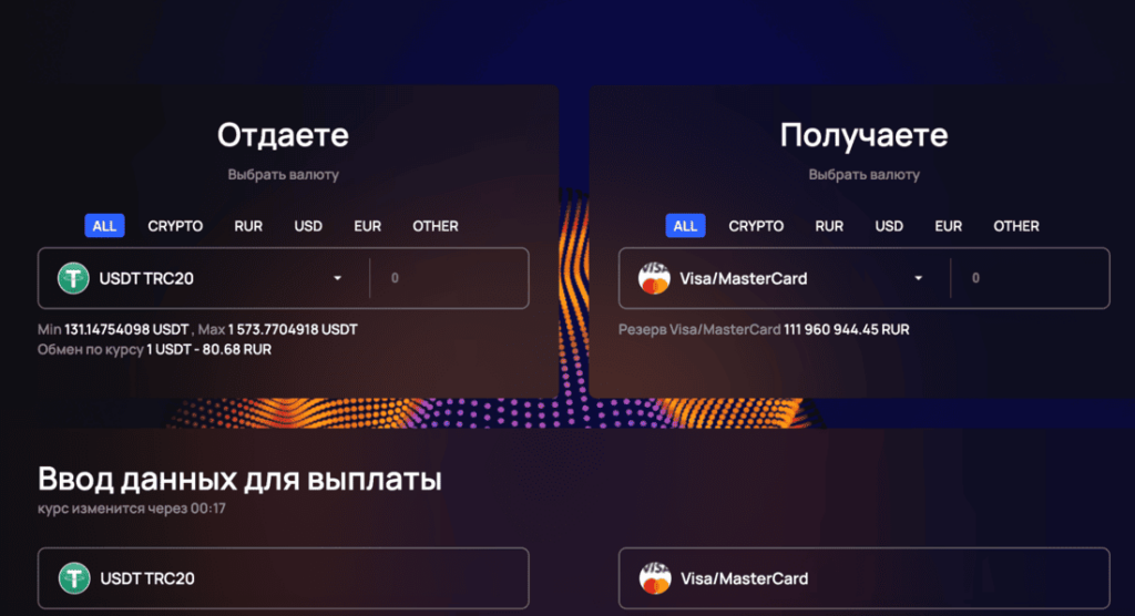 Важно понять одну вещь – обменник не “переводит крипту в фиат” напрямую. Он принимает вашу крипту и отправляет вам валюту со своих счетов. То есть это две разные операции, просто связанные между собой.