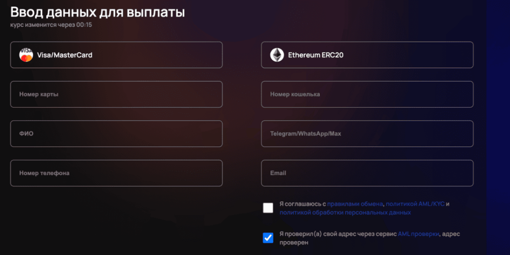 | 4. Создание заявки | Подтвердить обмен и получить адрес кошелька для перевода | У заявки есть таймер (обычно 10–30 минут) | Не затягивай — курс может измениться |