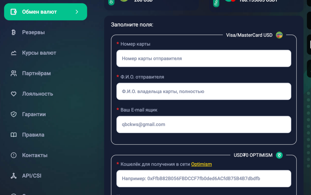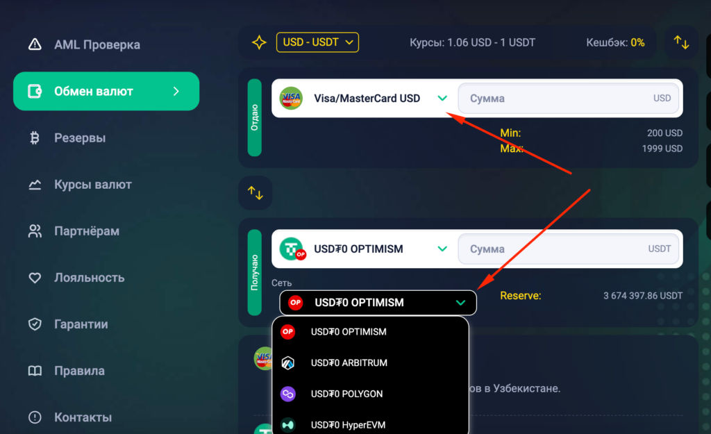 Здесь важно правильно выбрать направление и сеть. Потому что одна и та же валюта может работать в разных сетях.