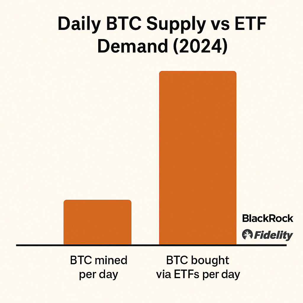 Что мы получили по факту? Институционалы запустили механизм масштабного накопления и стали поглощать ликвидность с рынка. Майнеры добывают ~450 BTC в день (после халвинга), а суточный приток в ETF в пиковые дни превышал 10 000 BTC.