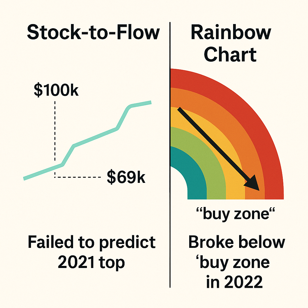 «Радужный» график (Bitcoin Rainbow Chart) – еще один популярный индикатор, который просто рисовал логарифмические кривые «зоны покупки» (синяя) и «зоны продажи» (красная). Он тоже ошибся в 2022, когда цена пробила «синюю» зону, чего не случалось никогда ранее.