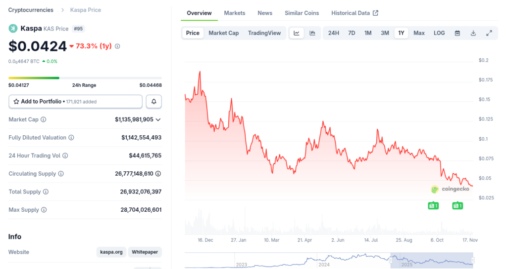 Институционалы рассматривают KAS как технологический хедж с потенциалом высокого отскока. Главные перспективы криптовалюты KAS в том, что это Fair Launch проект (товар/commodity). В условиях регуляторного давления на PoS-монеты, Kaspa может привлечь капитал как «чистый» PoW-актив, особенно привлекательный для покупки на текущих низких уровнях.