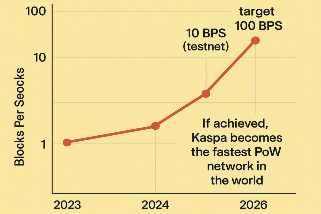 На практике это означает, что рост сети Kaspa не упирается в искусственный потолок пропускной способности. Уже сейчас в тестовой сети (после переписывания кода с Go на Rust) разработчики достигают показателей в 10 блоков в секунду (10 BPS). К 2026 году цель команды – выйти на 100 блоков в секунду. Если это удастся реализовать в мейннете, KAS станет самой быстрой PoW-сетью в мире, способной обрабатывать блоки быстрее, чем Visa обрабатывает транзакции (сохранив при этом безопасность Накамото-консенсуса).