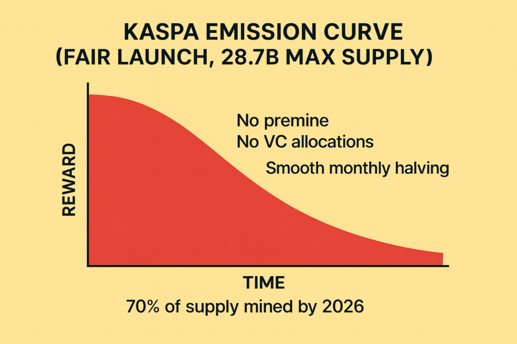 В отличие от многих современных L1-блокчейнов, которые печатают токены бесконечно (инфляционная модель) или раздают 50% эмиссии венчурным фондам, Kaspa имеет честный запуск (fair launch). Здесь не было премайна или аллокаций для инсайдеров.