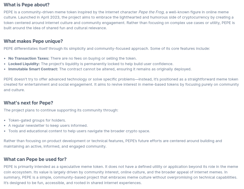 - Смарт-контракт PEPE прост, но инфраструктура вокруг (мосты, DEX) подвержена взломам. Потеря крупных объемов токенов в результате хака может обрушить курс за секунды.