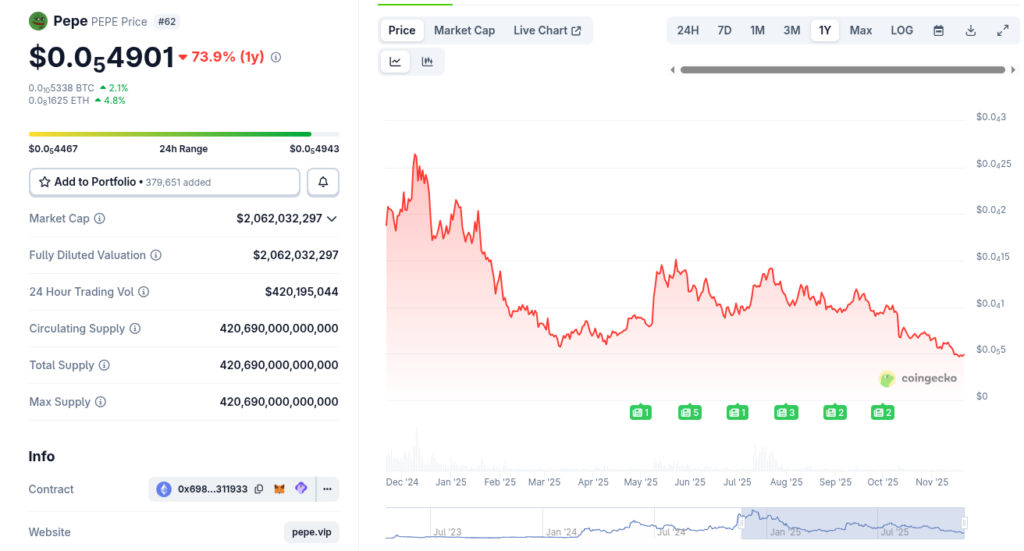 В отличие от проектов-однодневок, PEPE прошел проверку временем и медвежьими фазами локальных циклов. Киты не вышли из актива полностью, а маркетмейкеры продолжают поддерживать объемы торгов на топовых биржах. Так актив перешел из категории «лотерейный билет» в категорию «спекулятивный инструмент с высокой волатильностью».