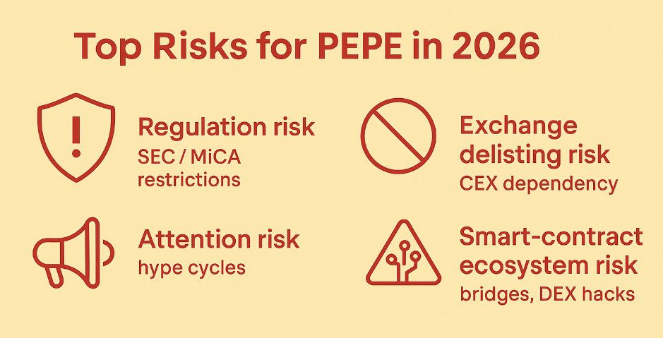 Любой прогноз курса PEPE должен учитывать «черных лебедей». Рынок криптовалют в 2026-ом будет гораздо более зарегулированным, чем сейчас.